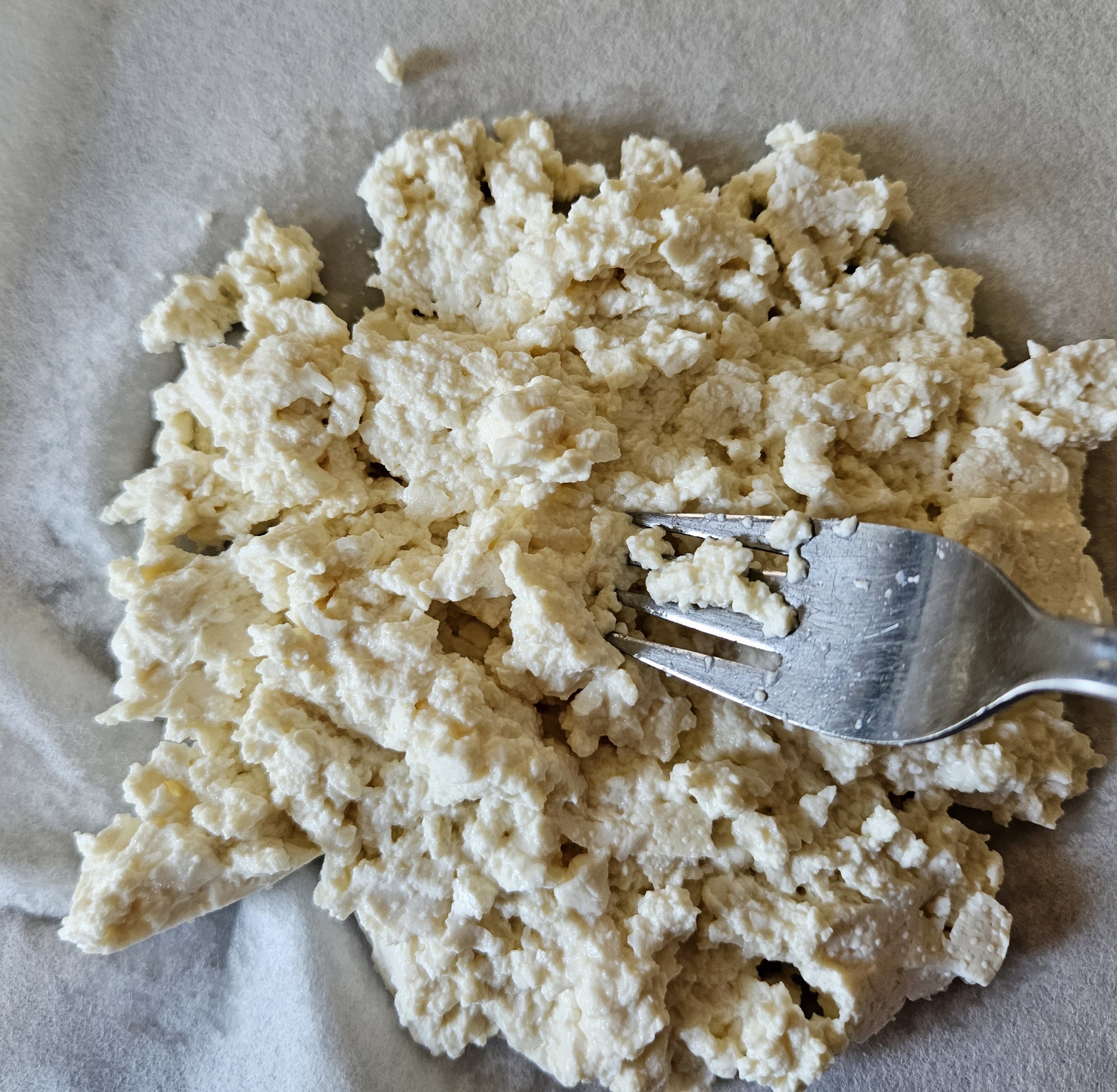 ①キッチンペーパーを2枚引いて、豆腐を崩す。