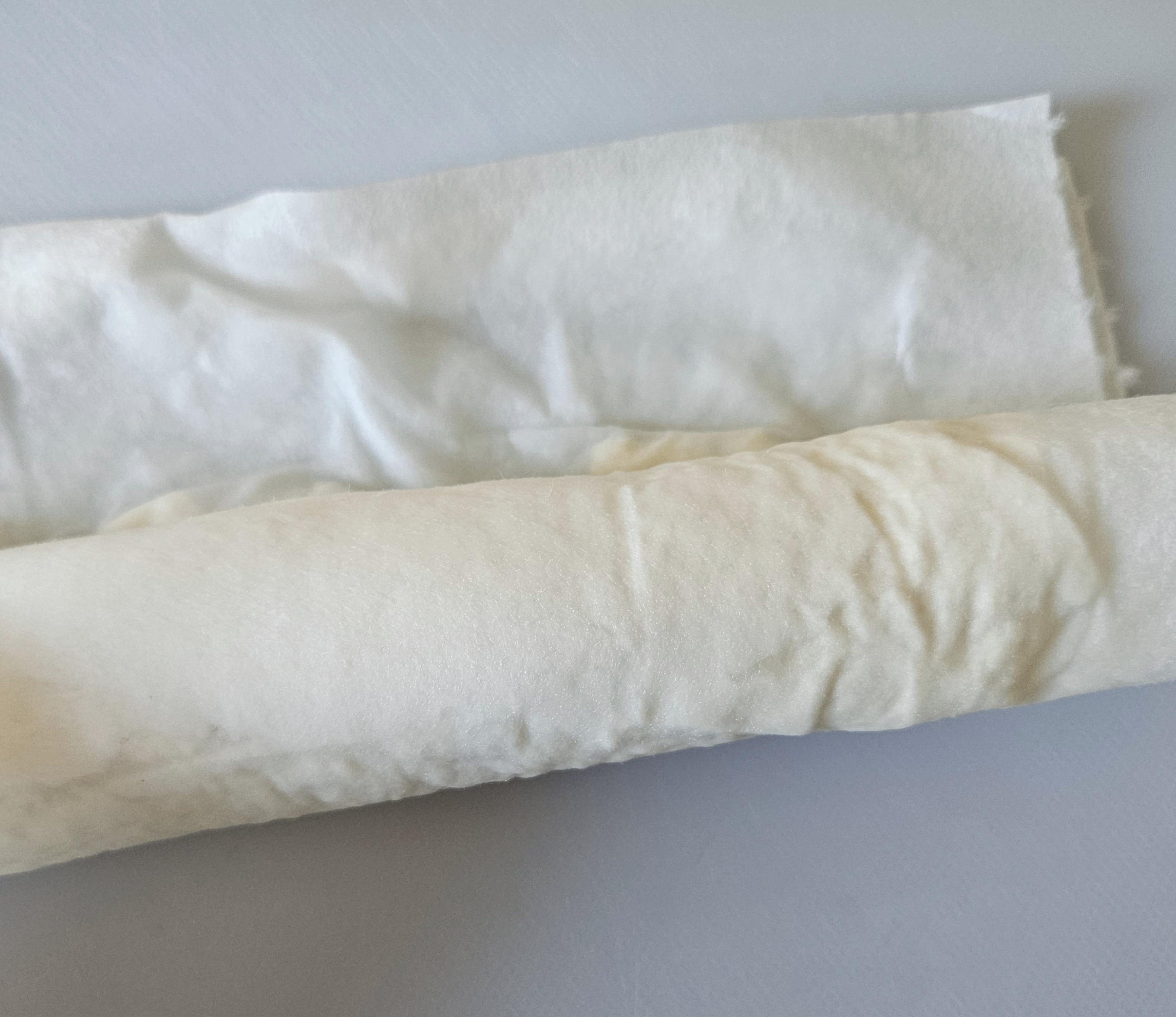 ②①の上にさらに2枚のキッチンペーパーをかぶせ、くるくる巻いて豆腐の水分を拭き取る。