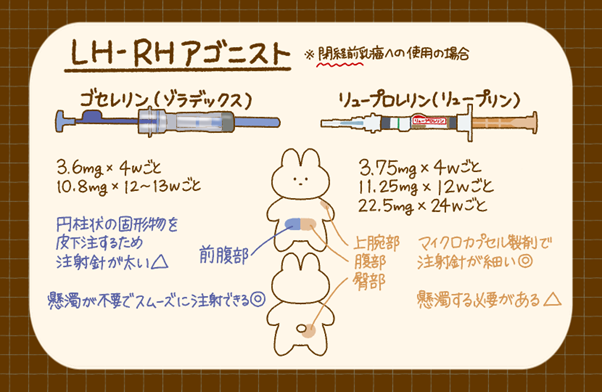 閉経前乳癌に使用される皮下注射剤です。下垂体のLHーRH受容体を持続的に刺激し、ダウンレギュレーションによってLH・FSHの分泌を抑制します。