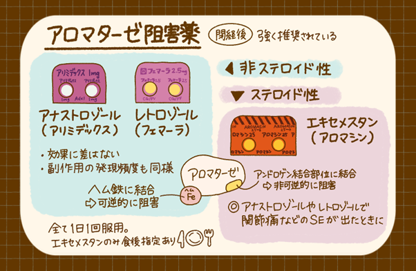 アロマターゼ阻害薬は閉経後や卵巣抑制下で使用され、末梢脂肪組織や副腎でのアンドロゲンからエストロゲンへの変換を阻害します。「非ステロイド性」と「ステロイド性」に分けられます。